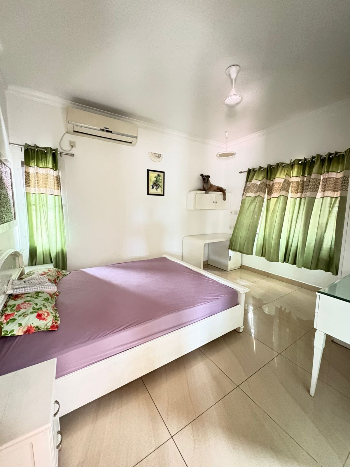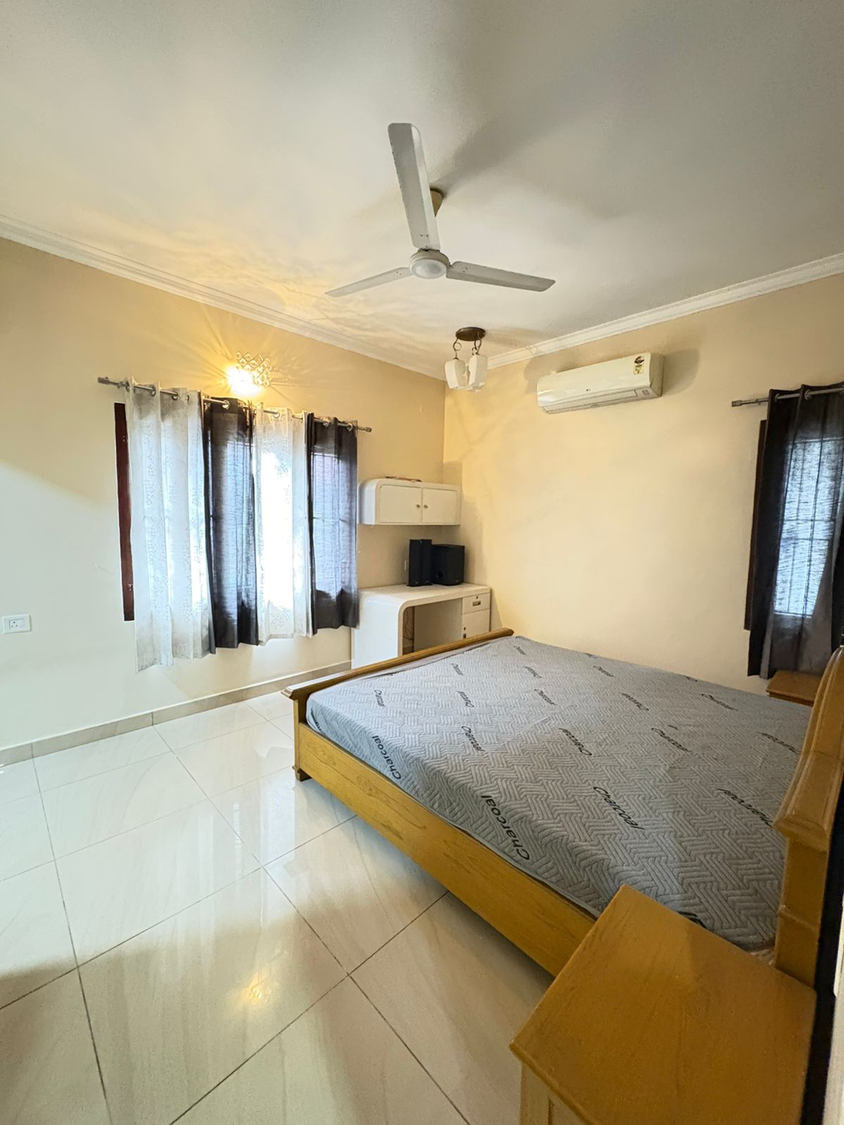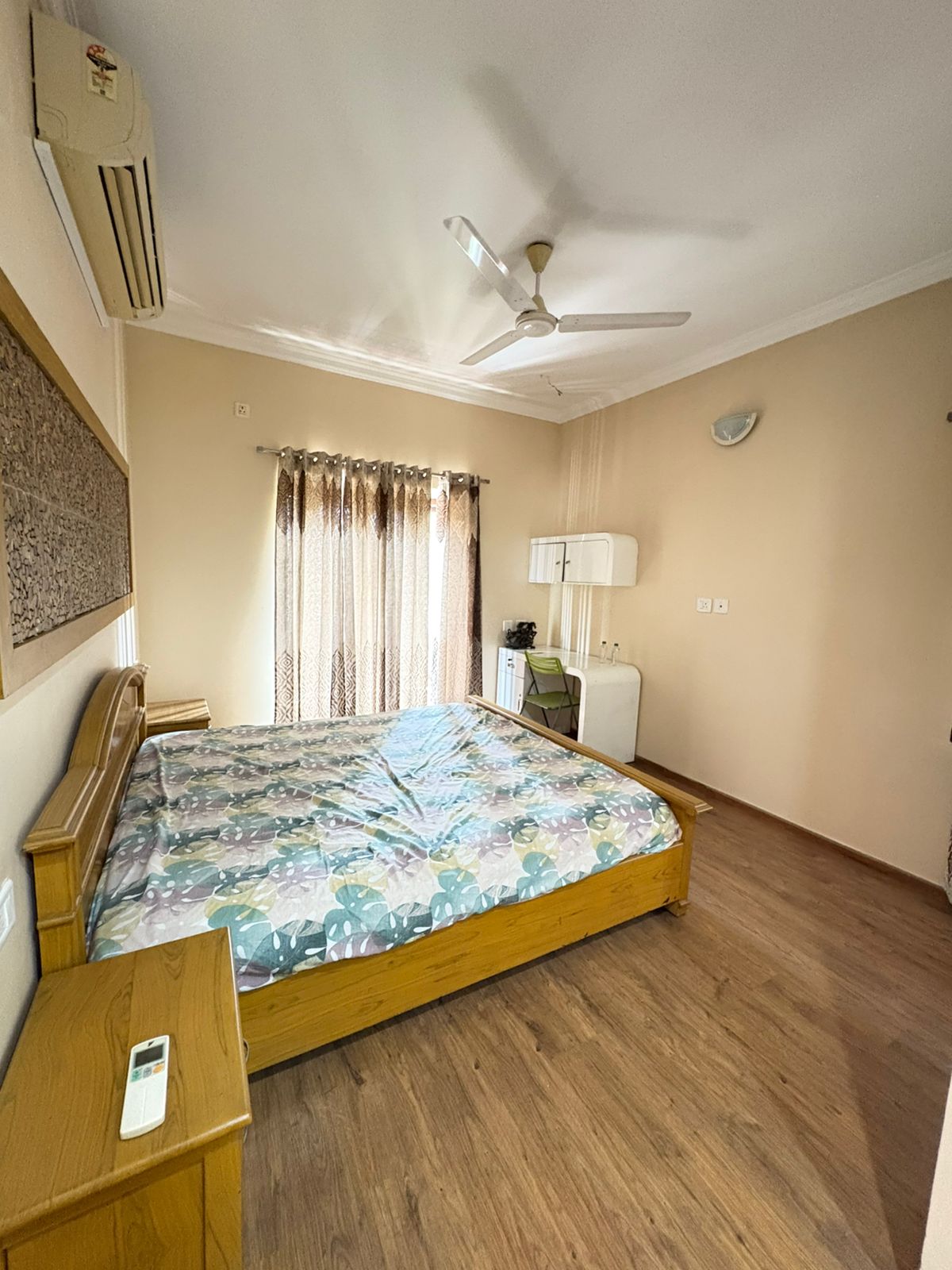 Includes four large bedrooms with beds, wardrobes, and air conditioning.