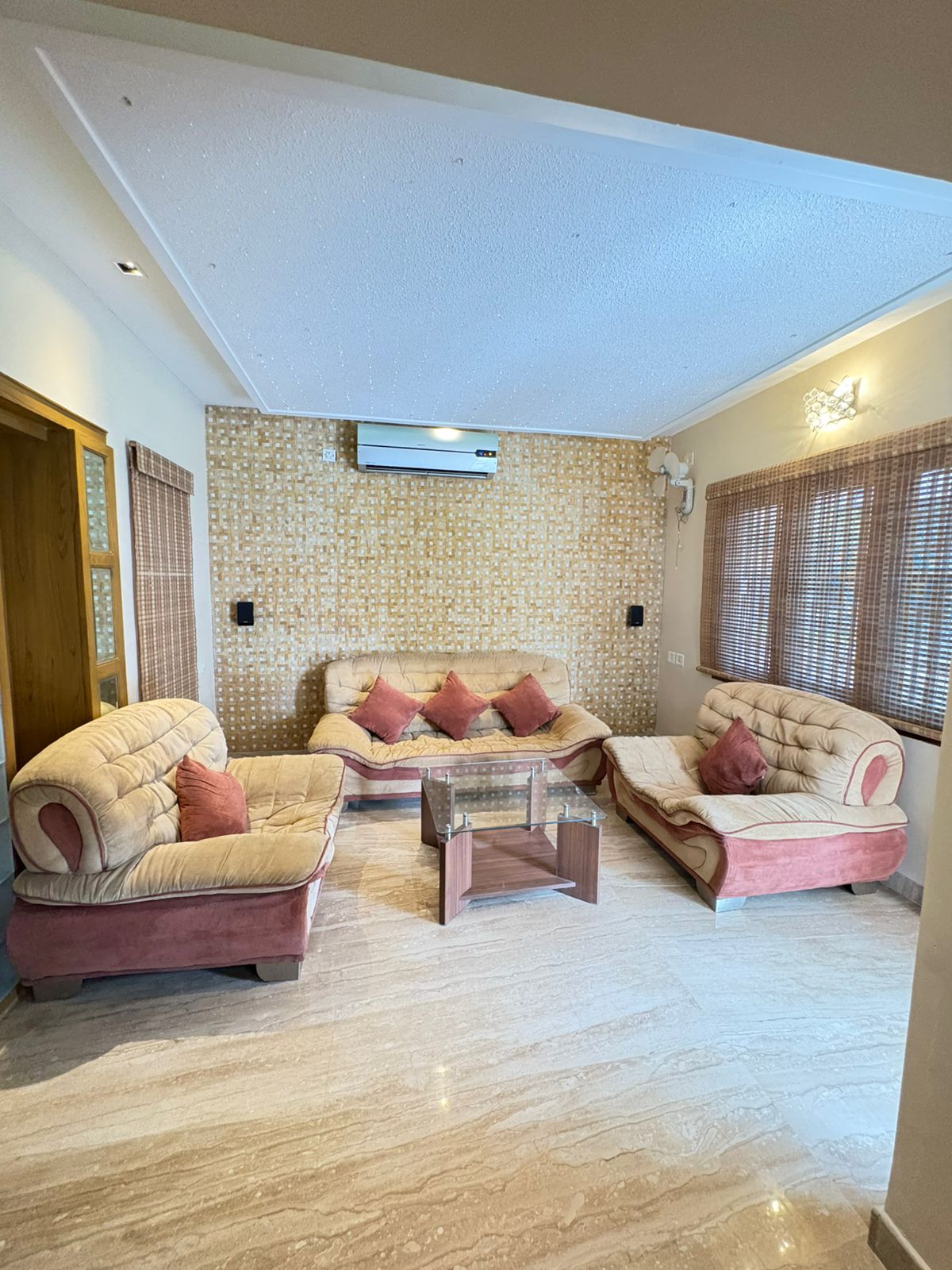 Fully furnished living and dining area with sofa set, TV unit, and dining table.