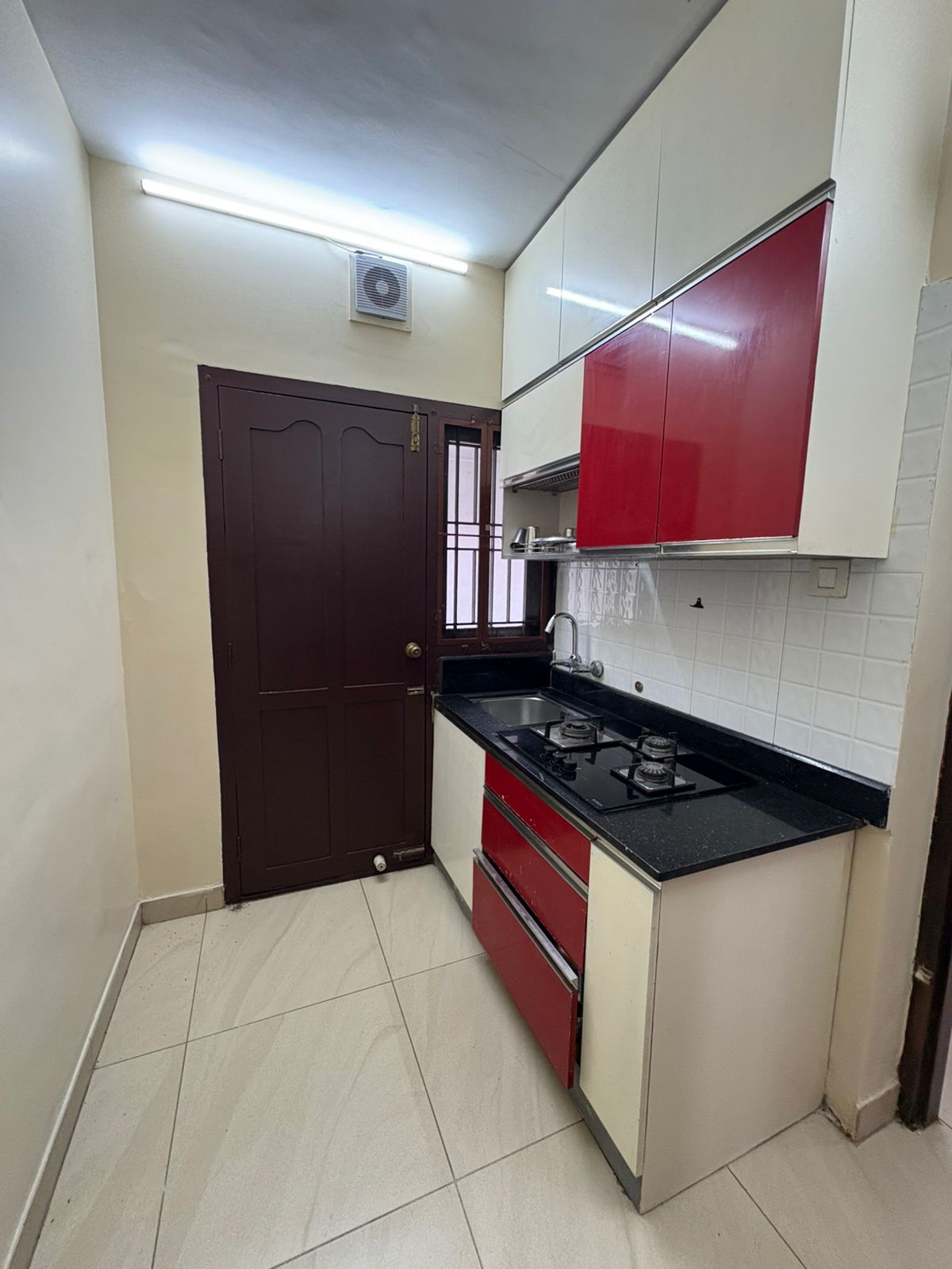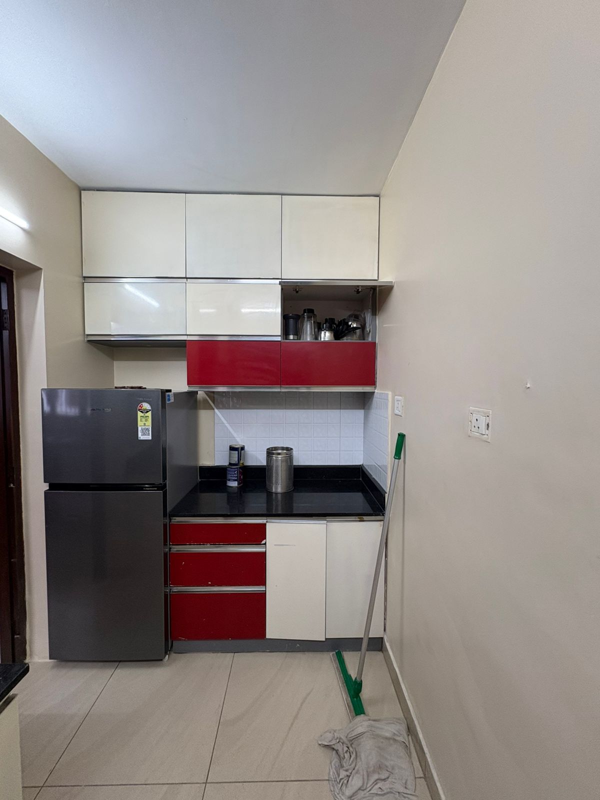 Modular kitchen equipped with cabinets, refrigerator, stove, and essential appliances.